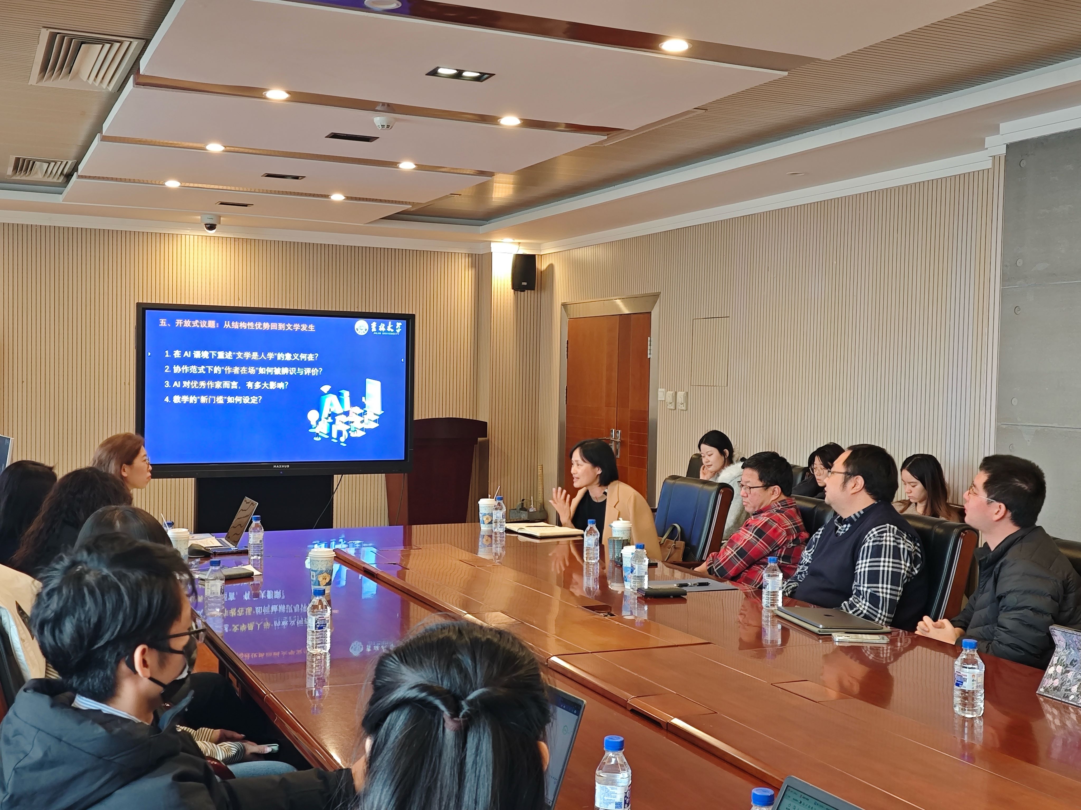 在评议环节,李冬梅教授肯定了报告的跨学科创新价值,指出在AI技术快速发展背景下,重新审视文学性标准具有重要的理论与现实意义。张涛教授从技术哲学层面分析了AI对文学创作主体的挑战,认为尽管技术进步不可逆转,但文学作为个体表达与精神创造的本质不会消失。刘帅池副教授从文学史书写角度指出,真正具有原创性的经典作品体现的是创作主体在特定历史情境中的独特生命体验,这是AI难以企及的高度。周鹏讲师从五四新文学传统出发,强调“文学是人学”这一命题在AI时代的价值,认为只要坚守文学对人的尊严和价值的关注,文学就不会终结。